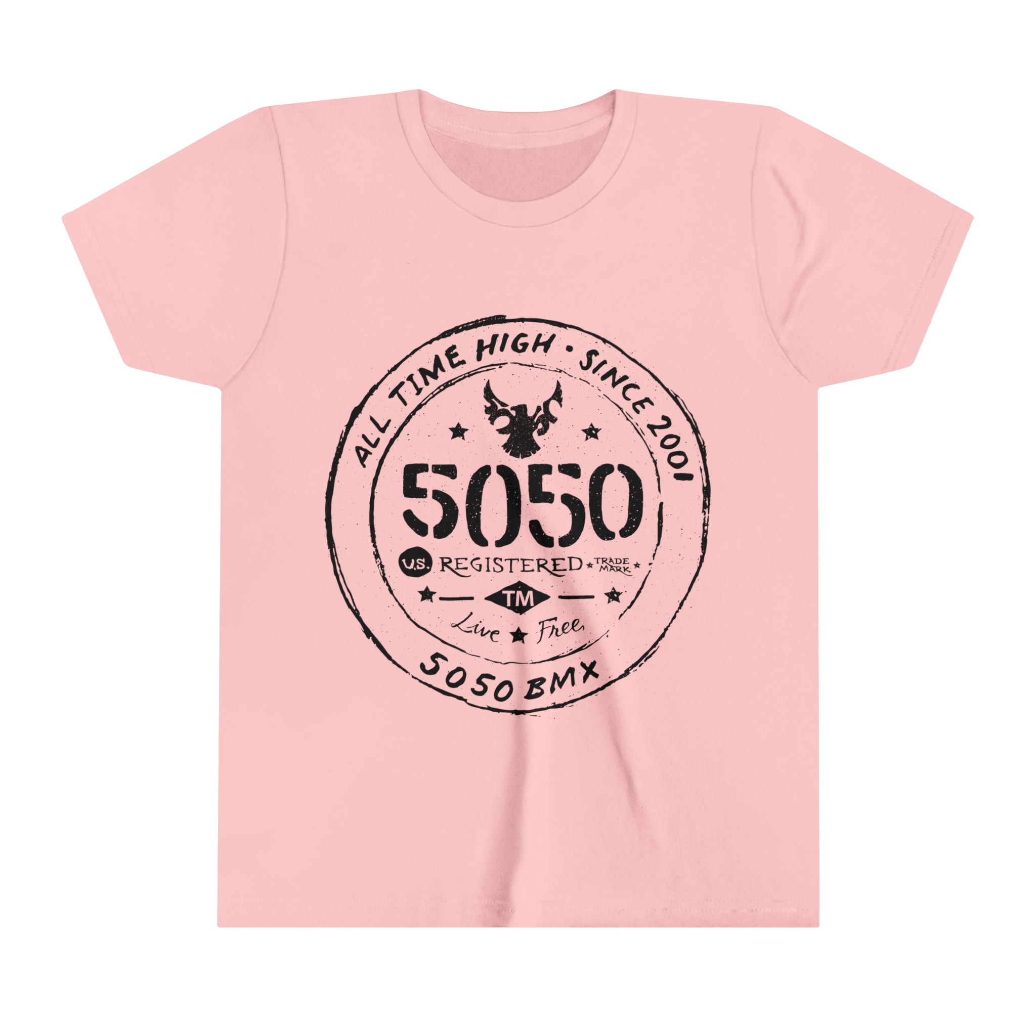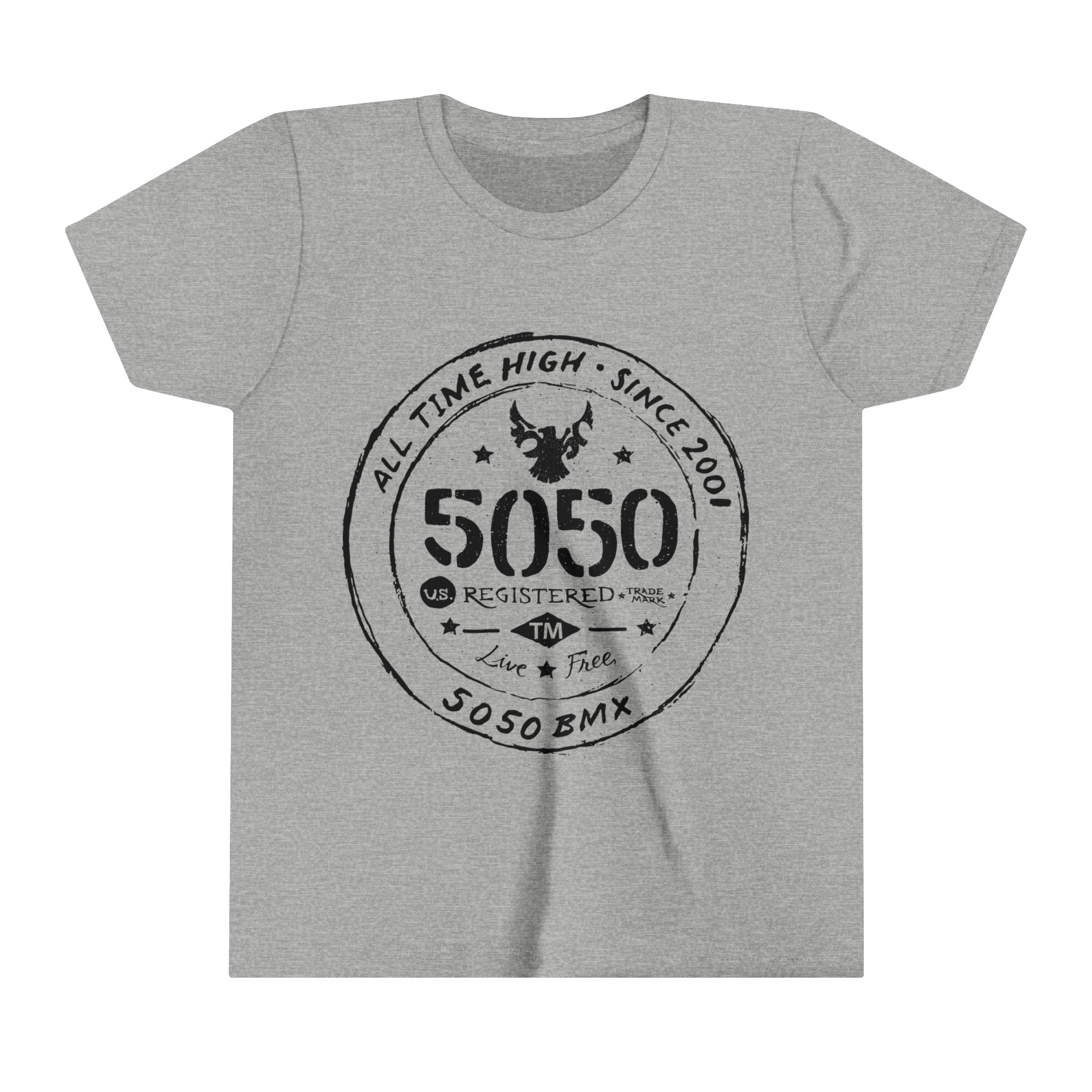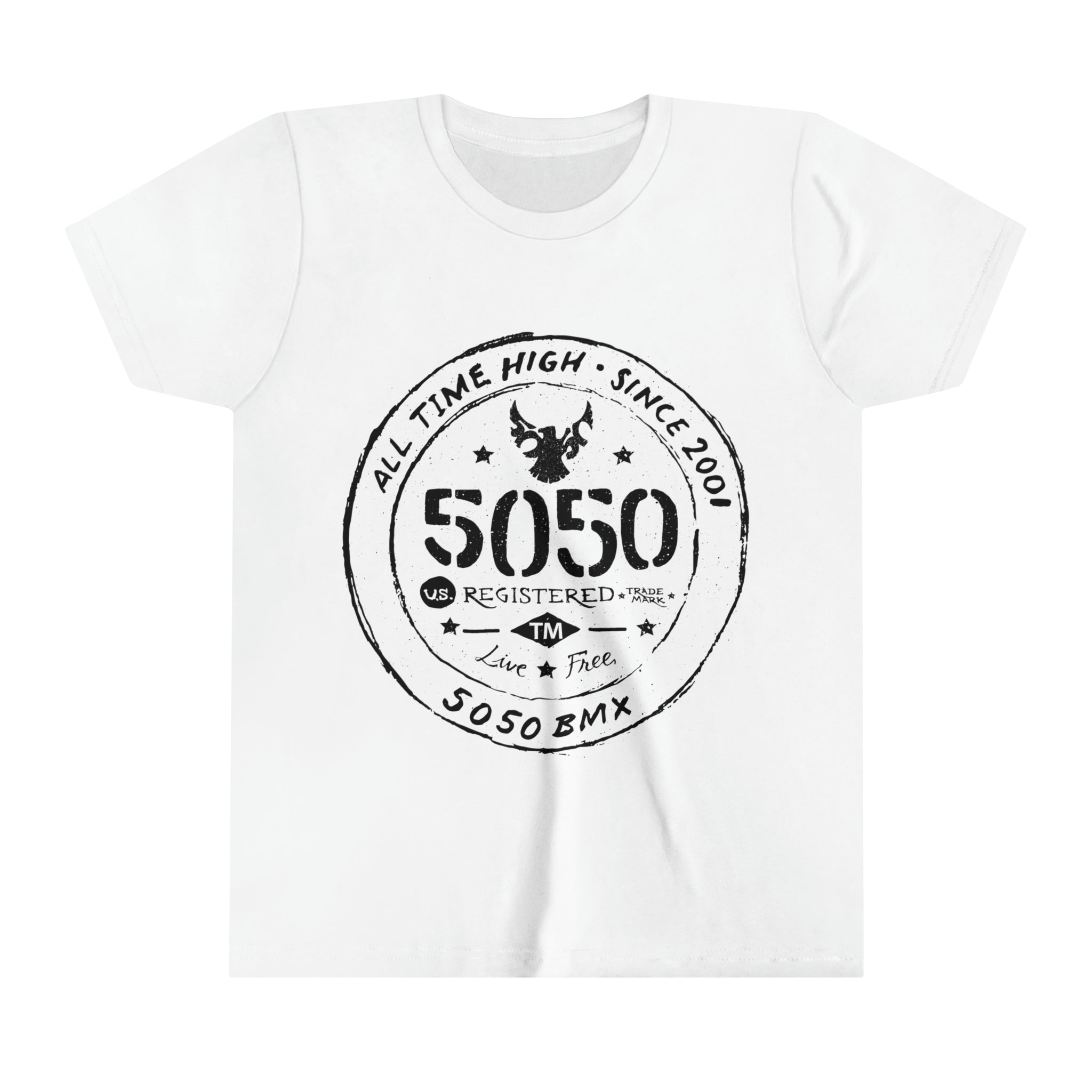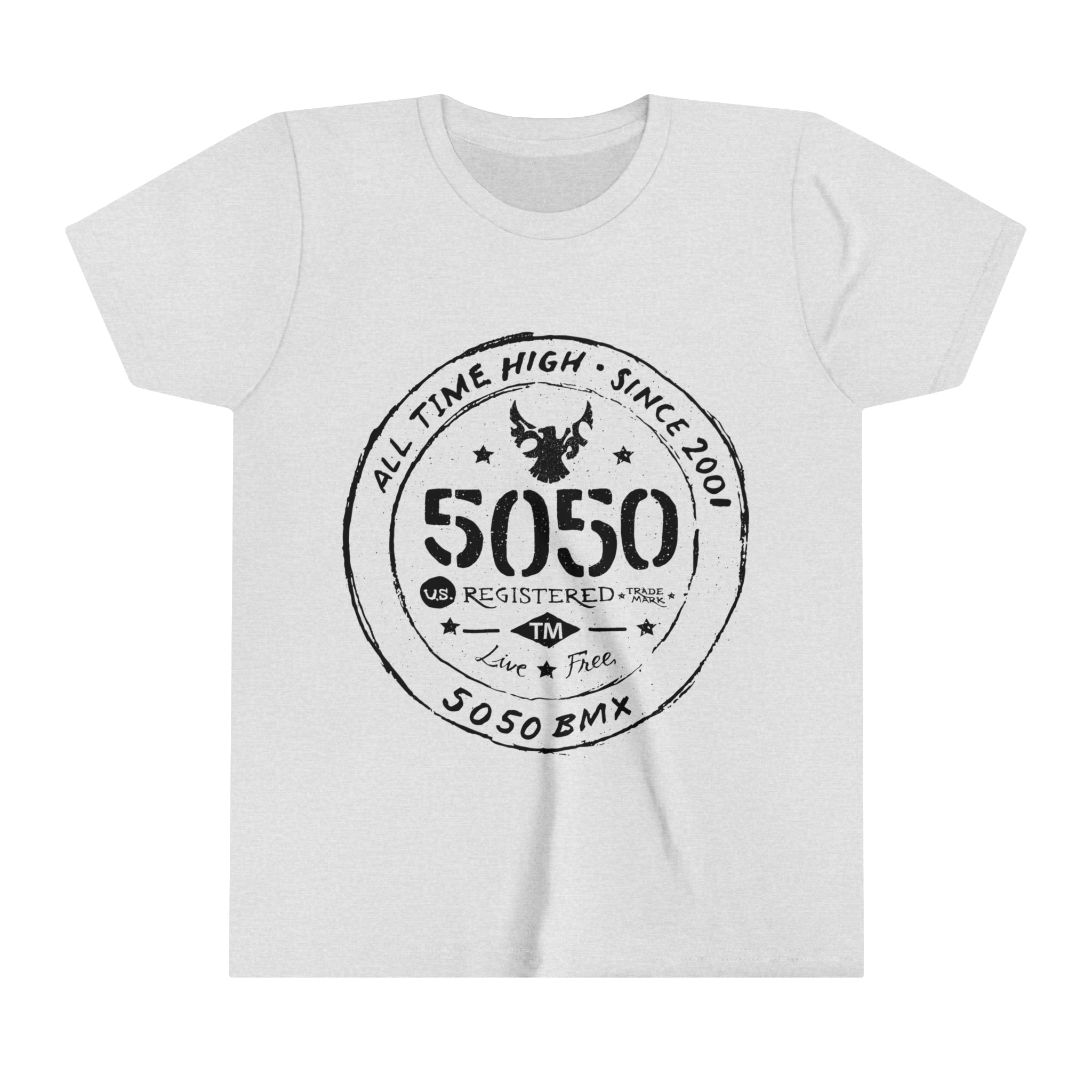 Introducing the 5050bmx.com All Time High Live Free - Youth Short Sleeve Tee – the raddest option for adventure-seekers. It's made of comfy 100% Airlume combed and ring-spun cotton. Tailored to perfection, including a tear-away label, side-seamed stitching, and shoulder taping, this tee not only looks good but performs well. Sustainably crafted in sizes S to XL – upgrade your wardrobe and take your adventuring to a new level! Let's get wild!
