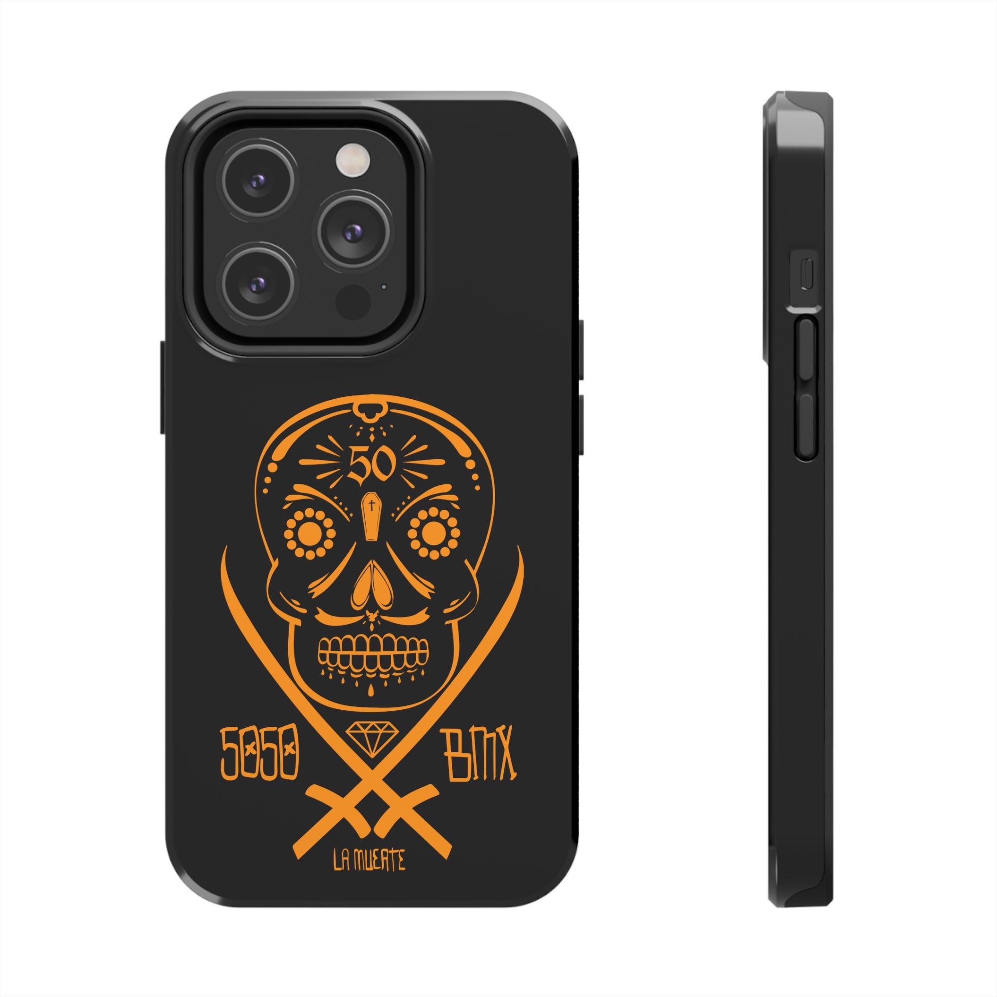Protect your phone in custom style with this 5050bmx La Muerte Skull tough phone case. This lightweight phone case is impact resistant and comes with the perfect surface to print all your ideas in vivid detail as well as crisp color.