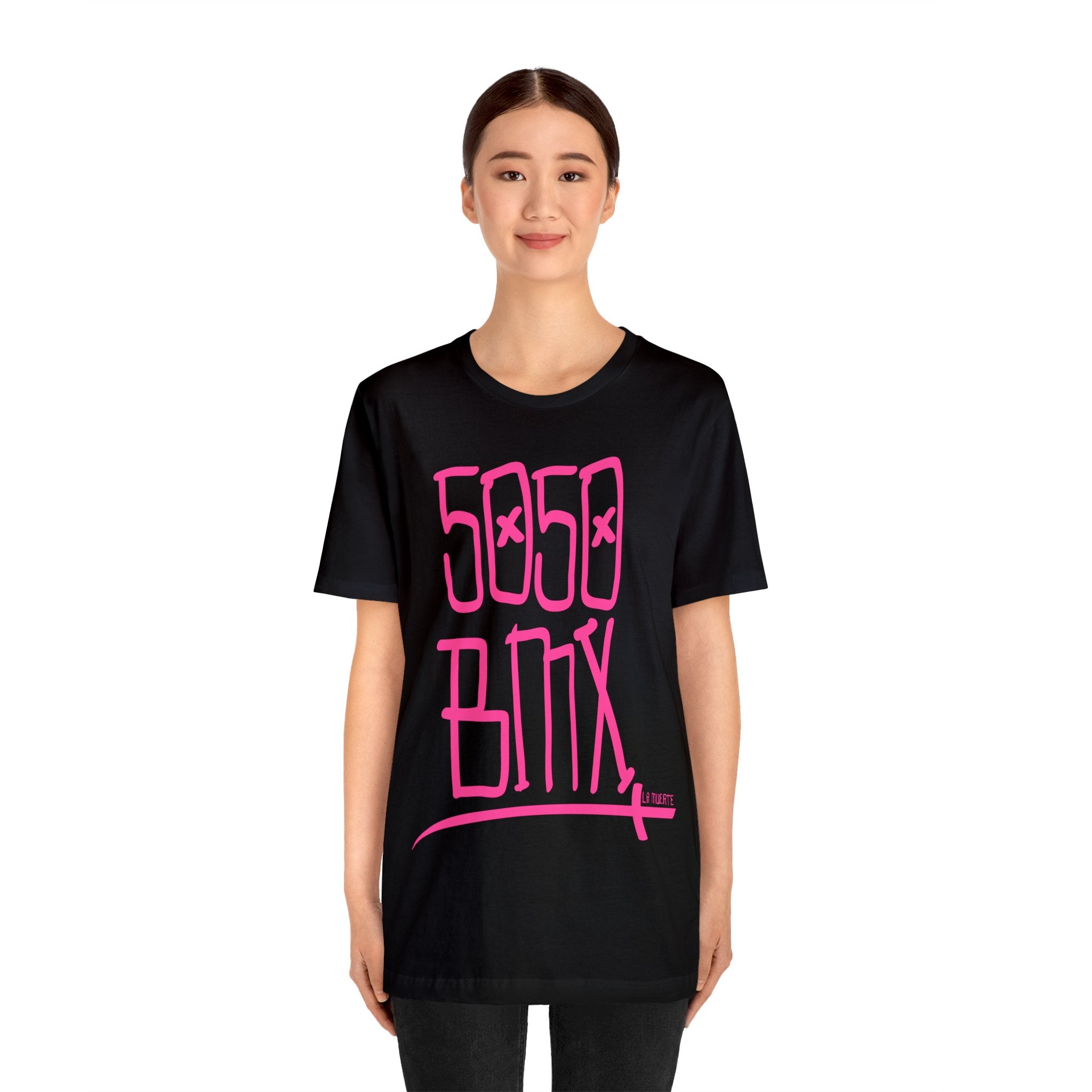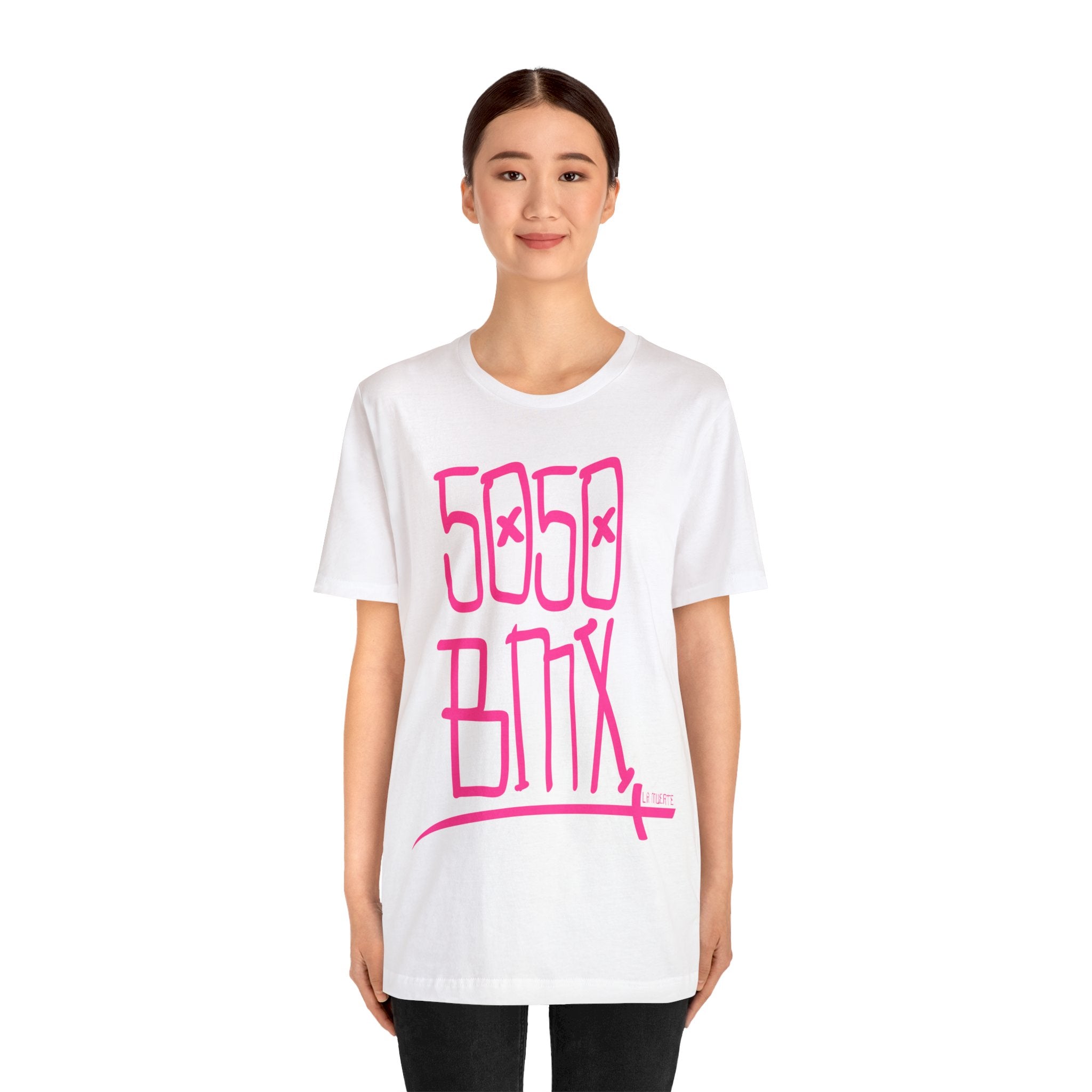 Introducing the 5050bmx.com Pink Scrawl - Short Sleeve Tee – the raddest option for adventure-seekers. It's made of comfy 100% Airlume combed and ring-spun cotton. Tailored to perfection, including a tear-away label, side-seamed stitching, and shoulder taping, this tee not only looks good but performs well. Sustainably crafted in sizes S to 4XL – upgrade your wardrobe and take your adventuring to a new level! Let's get wild!